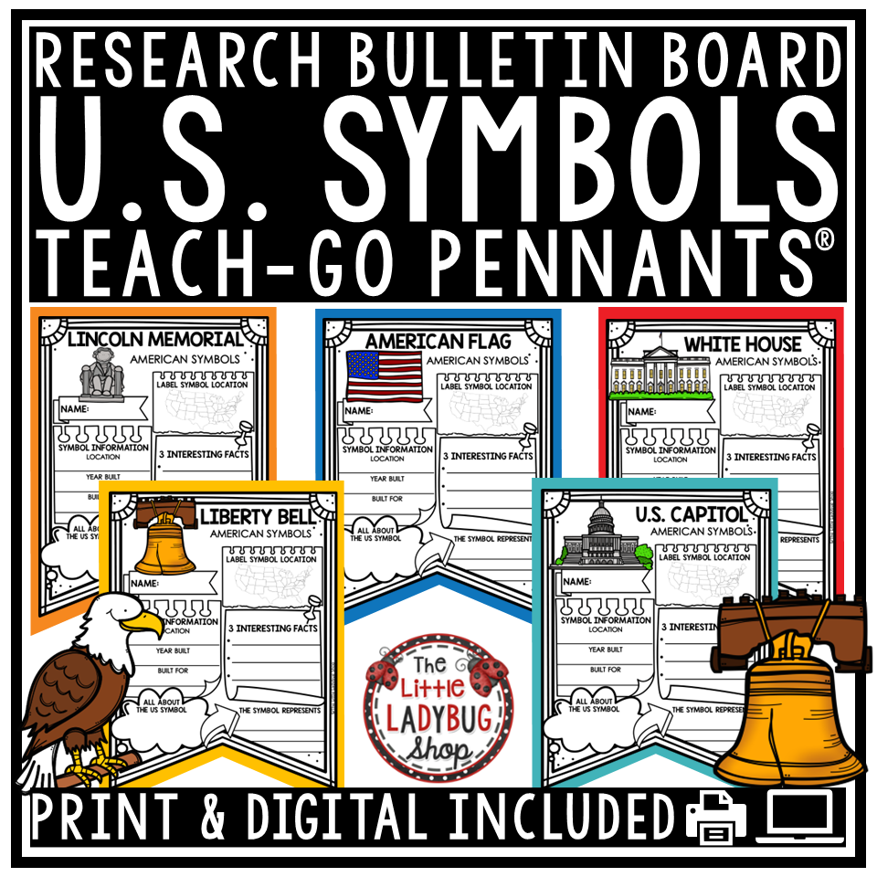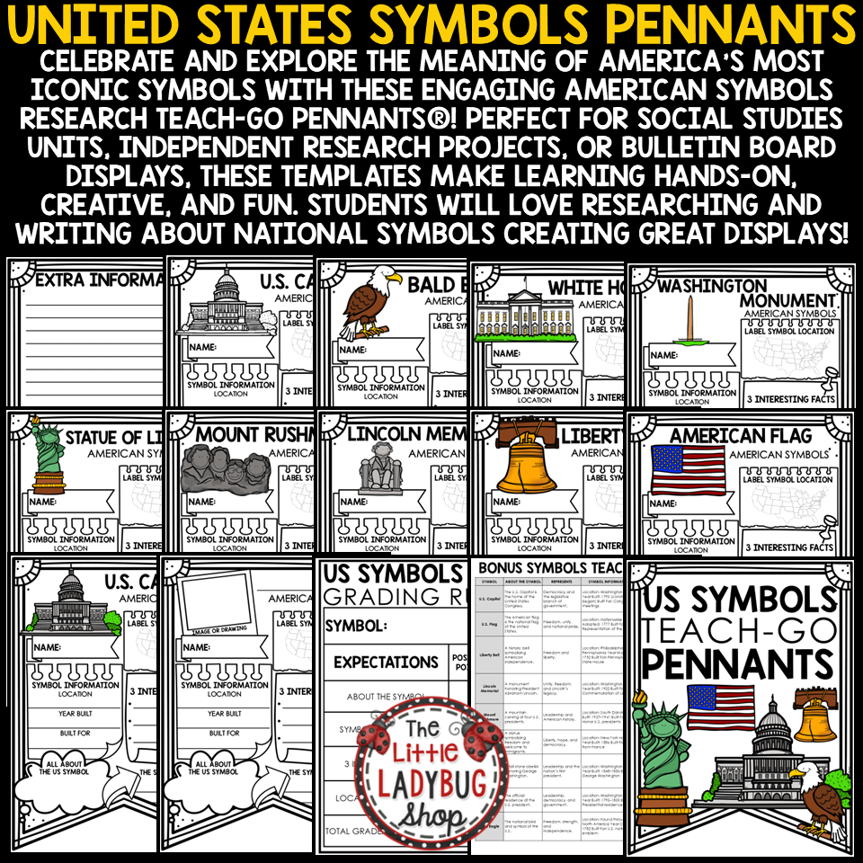 US Symbols of the United States American Landmark Activities Research Teach-Go Pennants®: Celebrate and explore the meaning of America’s most iconic symbols with these engaging American Symbols Research Teach-Go Pennants®! Perfect for Social Studies units, independent research projects, or bulletin board displays, these templates make learning hands-on, creative, and fun. Students will love researching and writing about national symbols while creating vibrant displays that showcase their hard work.