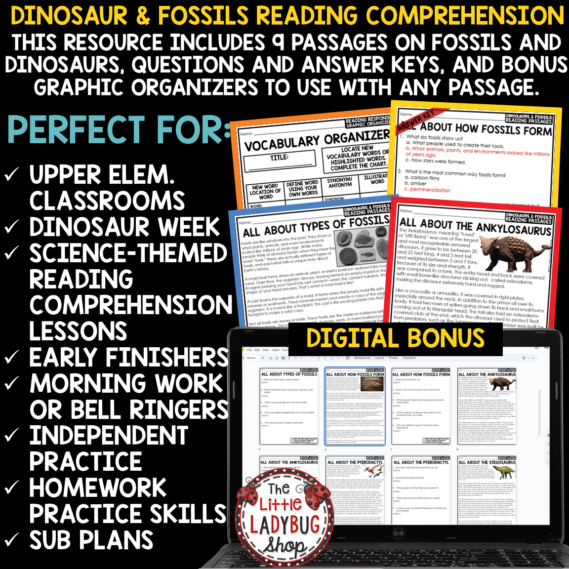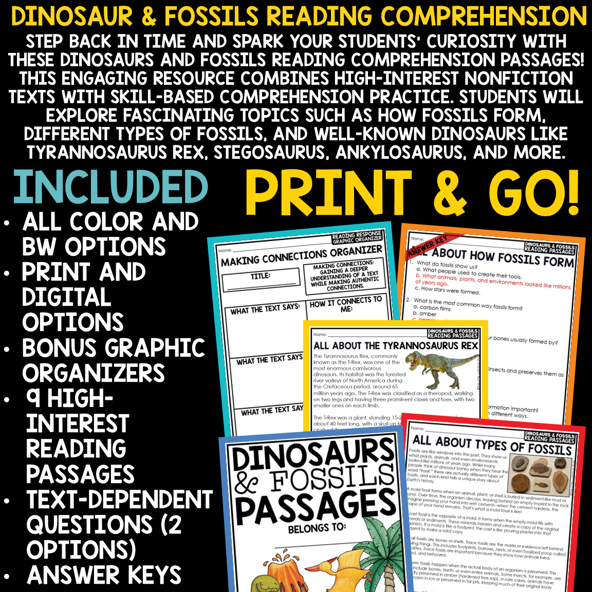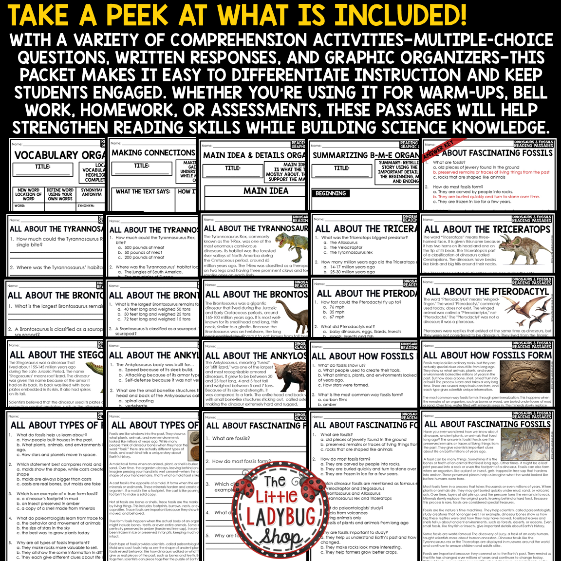 Dinosaurs Activities Reading Passages Types of Fossils Worksheets: Step back in time and spark your students’ curiosity with these Dinosaurs and Fossils Reading Comprehension Passages! Perfect for upper elementary readers, this engaging resource combines high-interest nonfiction texts with skill-based comprehension practice. Students will explore fascinating topics such as how fossils form, different types of fossils, and well-known dinosaurs like Tyrannosaurus Rex, Stegosaurus, Ankylosaurus, and more.