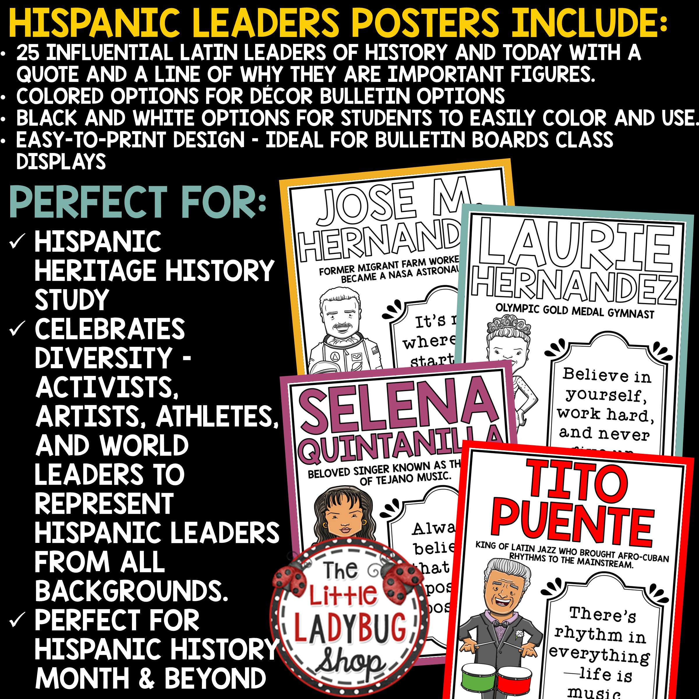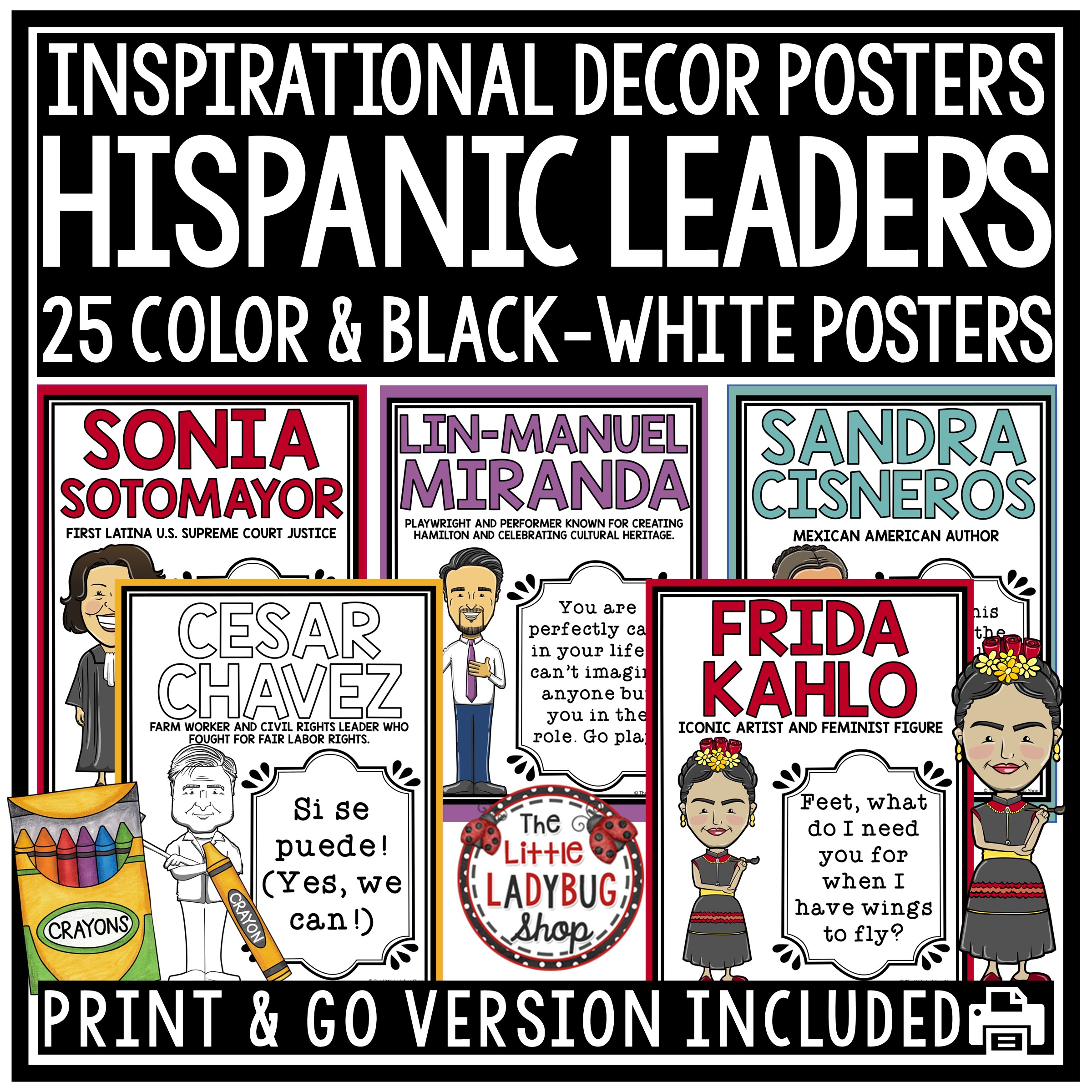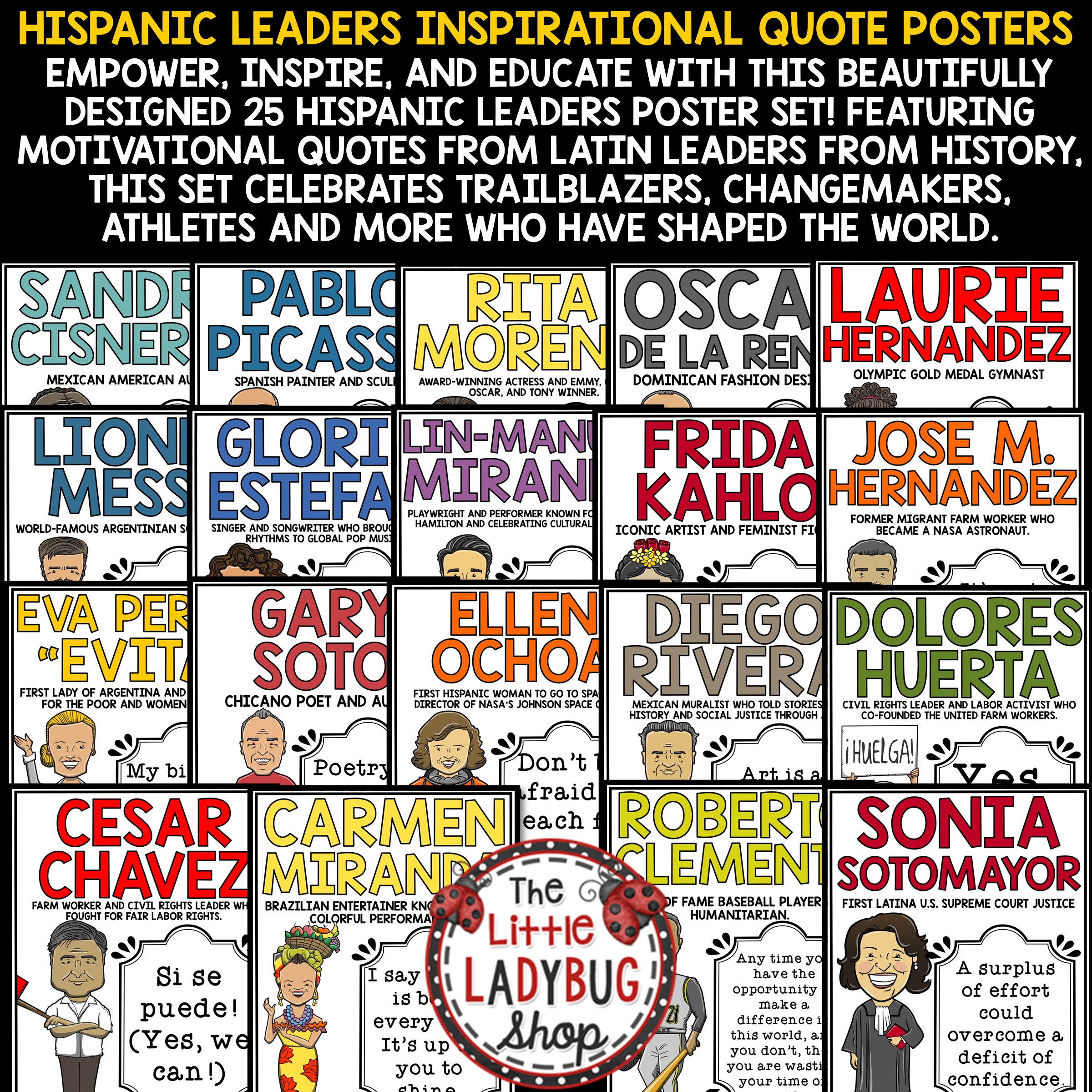 Hispanic Heritage Month Leaders Inspirational Quote Poster Set: Empower young minds with this Latino Leaders Inspirational Quote Coloring Sheets Poster Set, featuring 25 Influential Hispanics who changed the World with their courage and determination. Each poster highlights a powerful quote from a remarkable leader, inspiring students to dream big, lead boldly, and never give up!