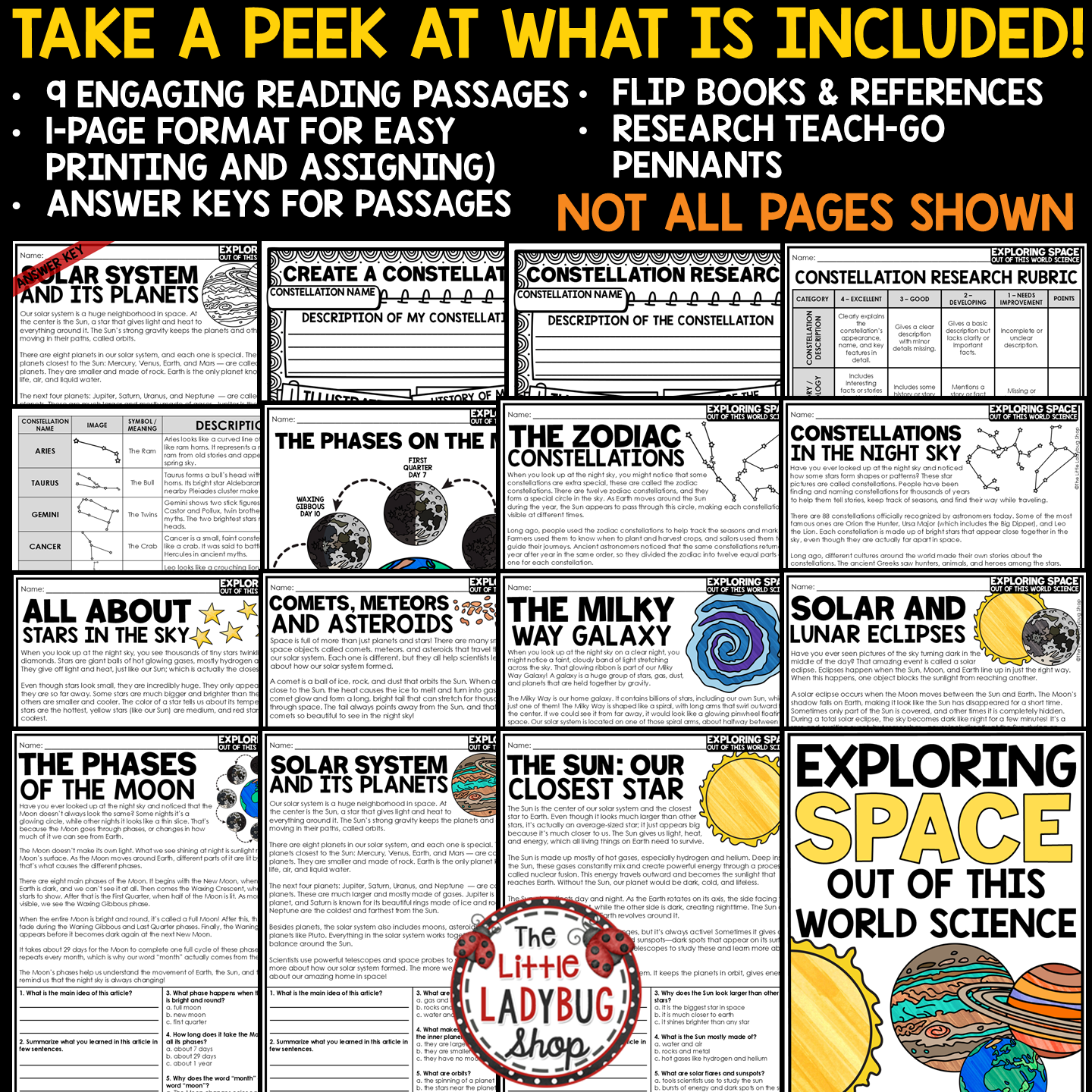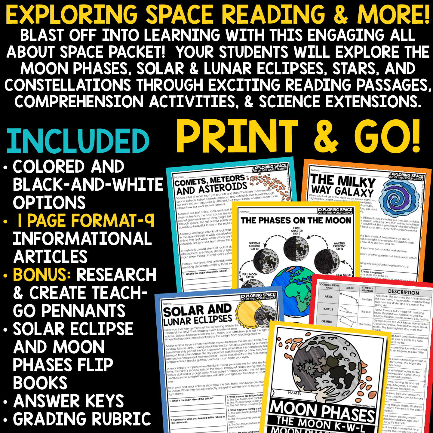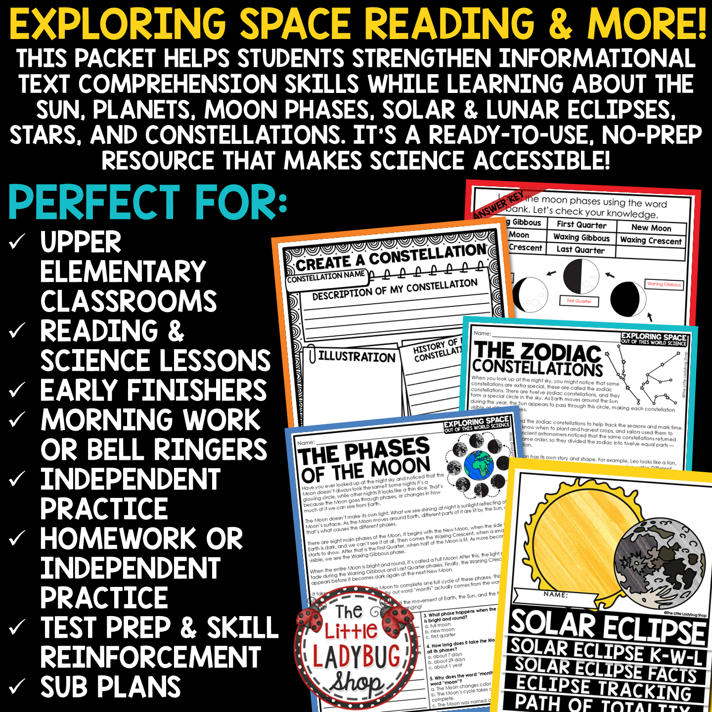 Exploring Space Packet: Moon Phases, Sun, Stars, Solar Eclipse & Constellations Activities: Blast off into learning with this engaging All About Space Packet! Your students will explore the Moon Phases, Solar & Lunar Eclipses, Stars, and Constellations through exciting reading passages, comprehension activities, and creative science extensions.